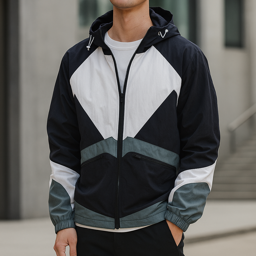 Crafted with our premium polyester blend and designed with a bold geometric panel pattern in contrasting tones, it features a full zip front, adjustable hood, and elastic cuffs for a secure fit.