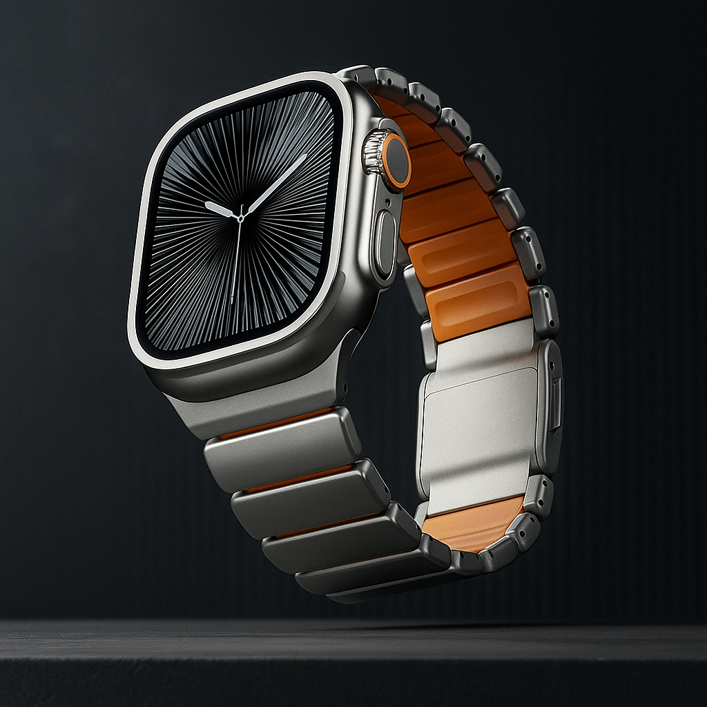 Engineered for those who demand precision and presence, crafted with aerospace grade Titanium and paired with fluoroelastomer (FKM), the band gains enhanced flexibility and breathability. Its streamlined magnetic clasp ensures a seamless, secure fit with effortless operation, while the sleek contouring mirrors the premium aesthetics of the Apple Watch, creating a look that’s as refined as it is resilient.
